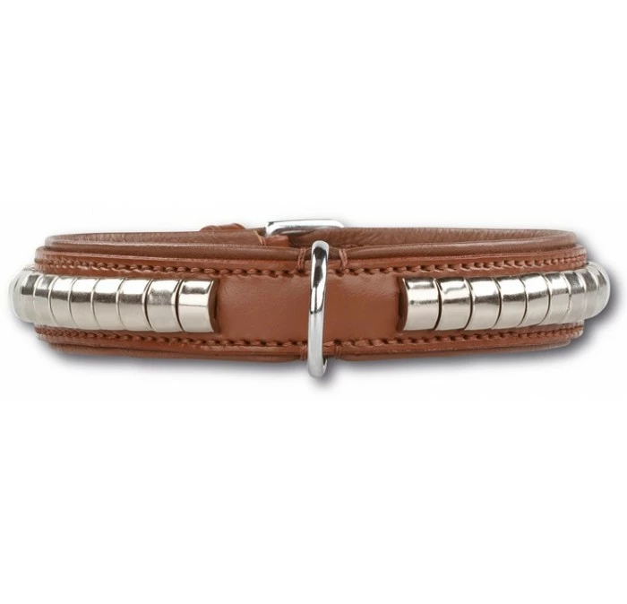 Wat een fantastische band is dit ! Deze band siert werkelijk iedere hond. De band is gemaakt van sterk bruin tuigleer, en gevoerd. De band is gesierd met een rij zilverkleurig beslag aan beide zijden van de ring. Dit model is een ware klassieker en blijft nog altijd fantastisch mooi !