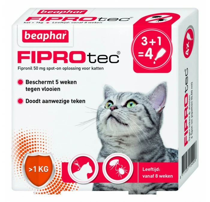 Fiprotec Spot-On kat is een vlooiendruppel tegen teken en vlooien bij katten vanaf 1kg en ouder dan 8 weken. Beschermt tot 5 weken tegen vlooien. Doodt aanwezige teken.
