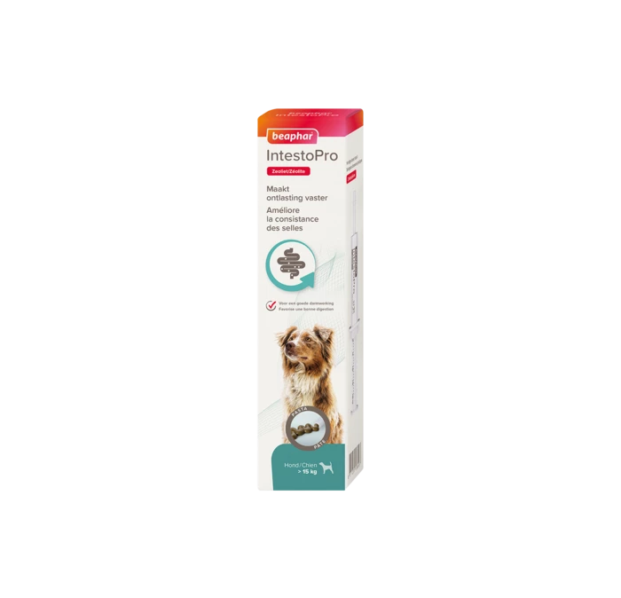 Beaphar IntestoPro pasta hond vanaf 15kg helpt darmproblemen te verlichten bij honden vanaf 4 weken oud en 1kg lichaamsgewicht. Het belangrijkste natuurlijke ingrediënt – zeoliet – helpt de ontlasting vaster te maken door overtollig vocht op te nemen. Het product bevat ook aluminiumhydroxide en FOS en MOS, die bekend staan om hun eigenschappen voor een goede darmwerking en het versterken van de darmflora. IntestoPro is zeer geschikt voor honden met wisselende of dunne ontlasting. Met handige doseerspuit, voor rechtstreekse toediening in de bek.