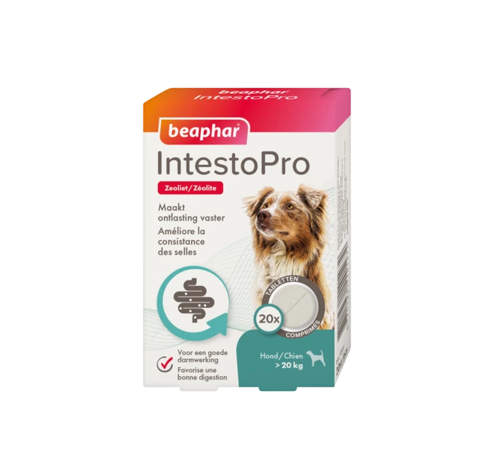 Beaphar IntestoPro tabletten helpen darmproblemen te verlichten bij honden vanaf 8 weken oud en minimaal 20 kilo. Het belangrijkste, natuurlijke ingrediënt – zeoliet – helpt de ontlasting vaster te maken door overtollig vocht op te nemen. Het product bevat ook aluminiumhydroxide en FOS en MOS, die bekend staan om hun eigenschappen voor een goede darmwerking en het versterken van de darmflora. IntestoPro is zeer geschikt voor honden met wisselende of dunne ontlasting.