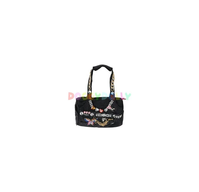 Designer dog carrier bagStevige draagtas, zonder schouderband. Voorzien van diversen kettinkjes, emblemen en glinstersteentjes.De korte zijdes zijn voorzien gaas, zodat de hond naar buiten kan kijken. De broekzak kan gebruikt worden om kleine dingen in op te bergen. De zijflap kan gebruikt worden als extra opbergruimte.Afmetingen: 36 x 24 x 22 cm (l x h x b)Geschikt voor honden tot 4 kg