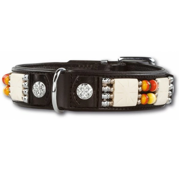 Deze zeer stevige halsband met kleurige applicaties is een ware blikvanger ! Zoals u gewend bent is ook deze halsband gevoerd met schitterend zacht kalfleer. De buitenkant is van stevig tuigleer, dus de grotere jongens en meiden kunnen nu ook prima met een kralenband worden uitgelaten !