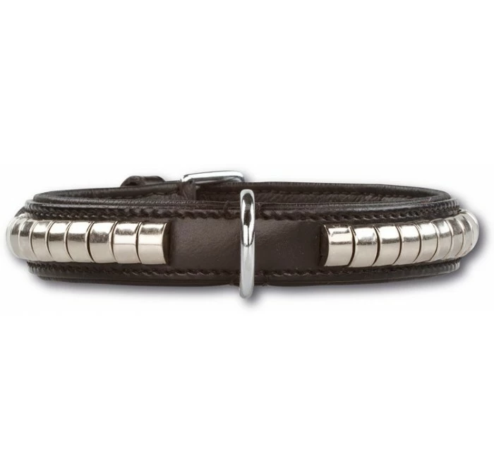 Wat een fantastische band is dit ! Deze band siert werkelijk iedere hond. De band is gemaakt van sterk zwart tuigleer, en gevoerd. De band is gesierd met een rij zilverkleurig beslag aan beide zijden van de ring. Dit model is een ware klassieker en blijft nog altijd fantastisch mooi !