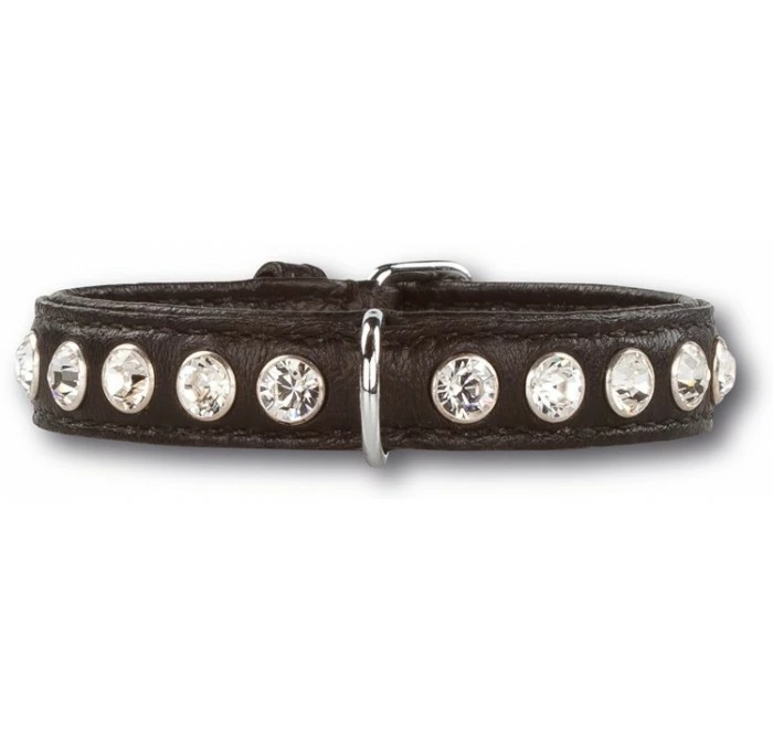 Voor de (zeer) kleine, middelgrote en grote honden zijn er deze opvallende zwarte lederen halsbanden met echte Swarovski stenen. De halsbanden zijn zacht gevoerd met zwart leer en voorzien van grote witte Swarovski stenen.