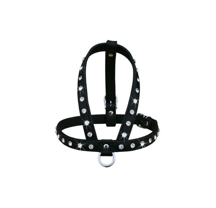 Deze schitterende leren tuigjes zijn riant belegd met grote strassstenen. Deze tuigjes zijn er voor de allerkleinste tot middelgrote honden en niet bedoeld voor (hard) trekkende honden.