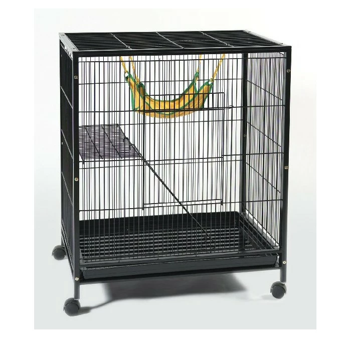 Let op! Extra bijdrage voor verzenden. Leuke kooi, die geschikt is voor fretten & chinchilla’s, door zijn tralie afstand adviseren wij deze kooi niet voor ratten. De kooi is gemaakt van metaal, voorzien van een plastic bak voor bodembedekking. De kooi wordt geleverd met de afgebeelde accessoires. Door de ruime deur kunt u overal goed bij. Tralieafstand: 18-22 mm Afmetingen: 96 x 80 x 50 cm (h x b x d)