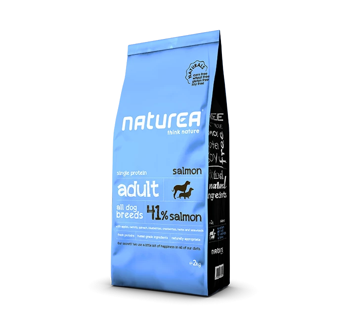 De Naturals Adult met zalm van Naturea is een volledig droogvoer voor honden van alle rassen dat voor wel 41% uit verse zalm bestaat. De ingrediënten worden nooit ingevroren, waardoor voedingsstoffen optimaal worden behouden. Dit voer bevat daarom alle voedingsstoffen die een hond nodig heeft voor een goede gezondheid. Het voer is vrij van mais, tarwe, soja en gluten en bevat uitsluitend ingrediënten van de hoogste kwaliteit, waardoor een heerlijke smaak gegarandeerd is. Dit voer is tevens vrij van conserveermiddelen en kunstmatige smaakstoffen.