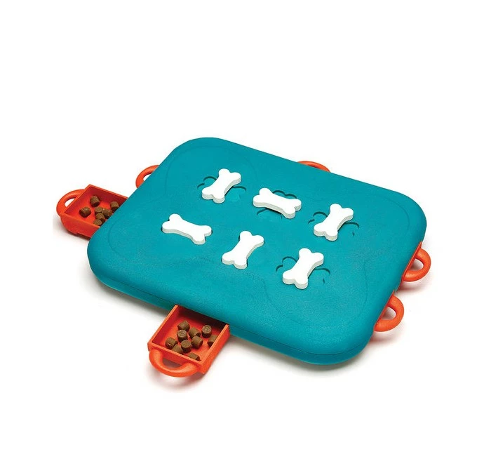 GEBRUIK: Laat je hond eerst gaan zitten en laat hem toekijken hoe je de lades vult met snoepjes. Laat de botjes in de deblokkeer stand staan en sluit de lades. Pas nadat je een teken geeft mag je hond beginnen. Om het moeilijker te maken kun je de botjes draaien waardoor ze de laatjes blokkeren. Eventueel kun je om je hond te helpen, de eerste paar keren onder de botjes ook een snoepje verstoppen. Hij zal dan het botje moeten draaien om bij het snoepje te kunnen komen. Laat hem vervolgens zien dat het gevolg is dat hij nu ook het laatje kan openen. Zo leer je hem deze combinatie. Geef aanwijzingen en prijs iedere voortgang enthousiast. Alle “hulpmiddelen” zijn toegestaan, in de vorm van krabben, duwen en likken. Het spel omgooien mag niet. Het spel heeft geen losse onderdelen. Helpen mag want het is de bedoeling om samen lol te hebben. Je zult versteld staan hoe slim je hond wel niet is om zelfs dit gokspel op te lossen. De Dog Casino kan zowel binnen als buitenshuis gebruikt worden. Het spel is bedoeld om samen te spelen en niet om je hond alleen mee te laten. Berg na afloop het spel altijd op voor de volgende keer.